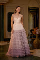 فستان سهرة بتصميم خاص يجمع بين الرومانسية والأناقة، يتألق بتدرجه الليلكي الباستيلي. تفاصيل الدانتيل الرقيقة المطرزة على قماش التول الشفاف عند الصدر تضفي لمسة فنية، بينما تضفي طبقات الكشكشة المتدلية من الكتفين إلى التنورة مظهرًا ديناميكيًا وواسعًا.