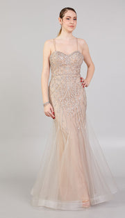 فستان سهرة بتصميم حورية البحر مع أشرطة من الحبال وتفاصيل من التول المطرز