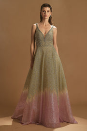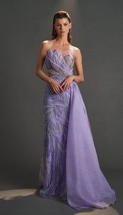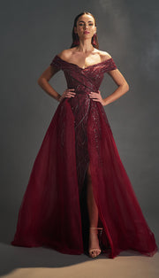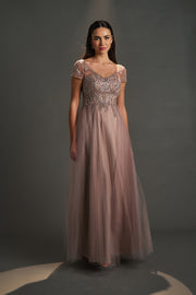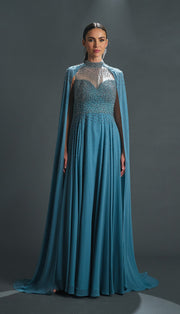 فستان سهرة خاص بتفاصيل ياقة متدرجة، كيب وتطريز