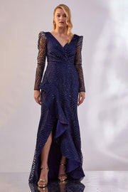 فستان سهرة بتفصيلة كيب على الخصر وتفاصيل مطرزة على الصدر