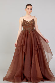 فستان سهرة بتفاصيل مطرزة، وحمالات، وتنورة من التول
