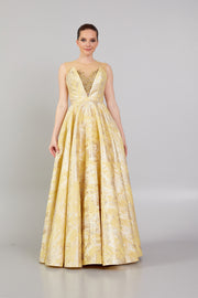 فستان سهرة من الجاكار المنقوش مع تفاصيل تطريز على الصدر