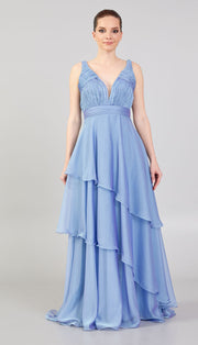 فستان سهرة بتفاصيل مجمعة عند الصدر مع تنورة ذات طبقات