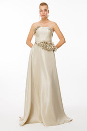 PARLAK KUMAŞ ÇİÇEK DETAYLI STRAPLEZ ABİYE