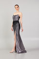 Bu göz alıcı abiye elbise, özel günlerinizde size zarafetin ve ışıltının doruklarını yaşatır. Çift renkli simli kumaşı ve straplez tasarımıyla dikkat çeker.