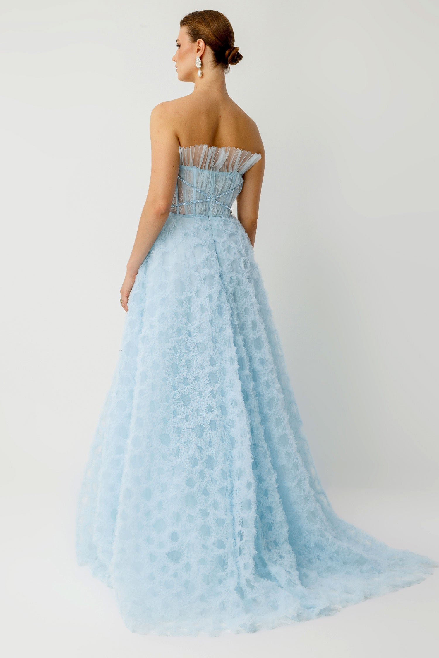 • Straplez ve transparan pliseli tül üst tasarım
