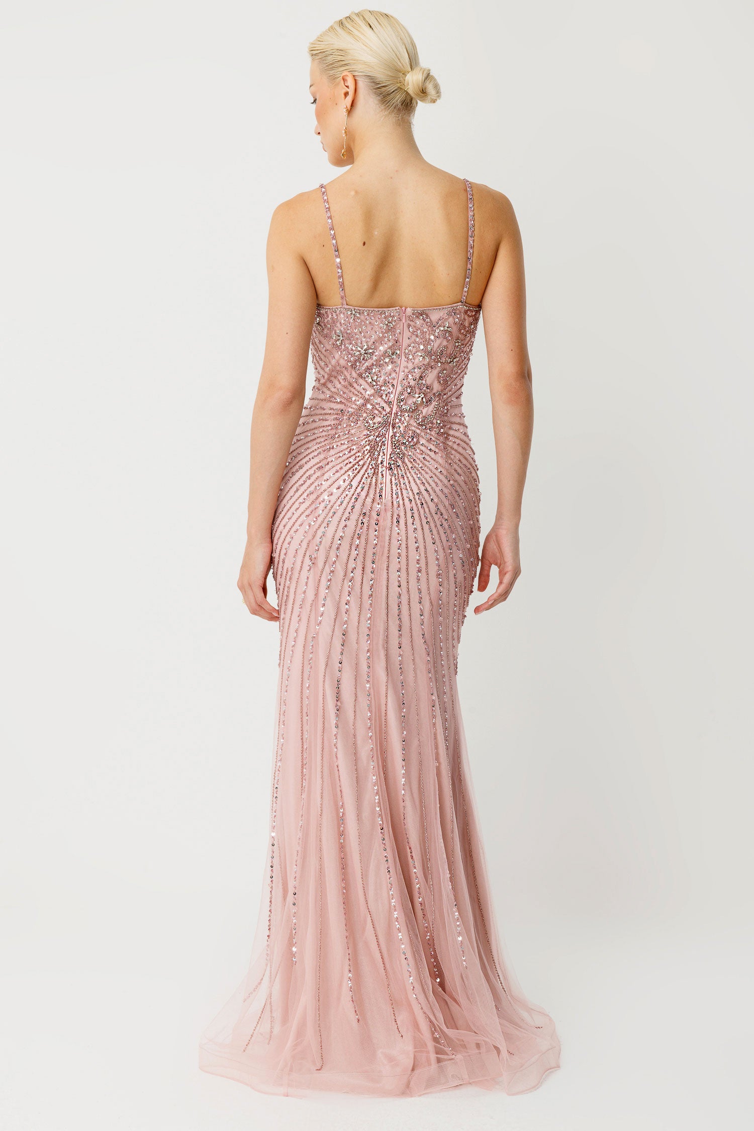 Pudra tonundaki bu askılı haute couture abiye, yoğun kristal ve taş işlemeleriyle ışığı kusursuz şekilde yansıtır. Göğüs kısmındaki kalp form detay feminen bir siluet sunarken, belden aşağı doğru yayılan radyal taş işçiliği vücut formunu zarif şekilde vurgular.