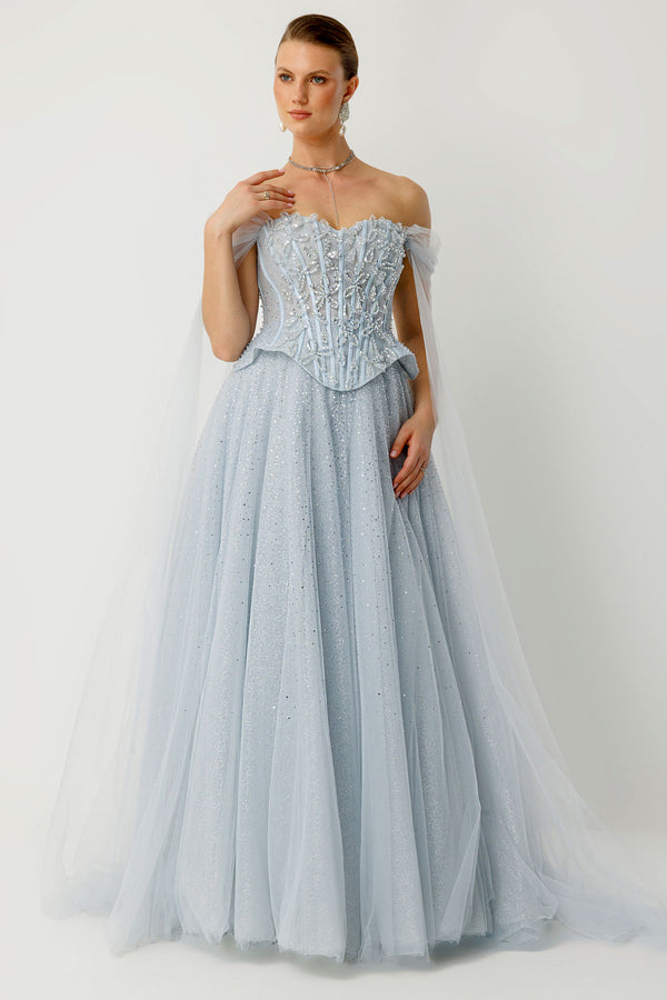 The corset-style bodice, crafted with intricate hand embroidery resembling crystals and pearls, elegantly shapes the figure, while the sheer tulle cape detail cascading from the shoulder adds a fairytale quality. The voluminous skirt design, composed of shimmering tulle layers, reflects light with every step, creating a striking silhouette.