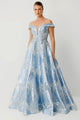 Designed in shades of ice blue, this princess-style gown offers a captivating silhouette with its voluminous skirt and three-dimensional floral embroidery. The off-the-shoulder V-neck provides an elegant décolletage, while the intricately hand-embroidered crystal and floral appliqués at the waist add a sophisticated sparkle to the design.
