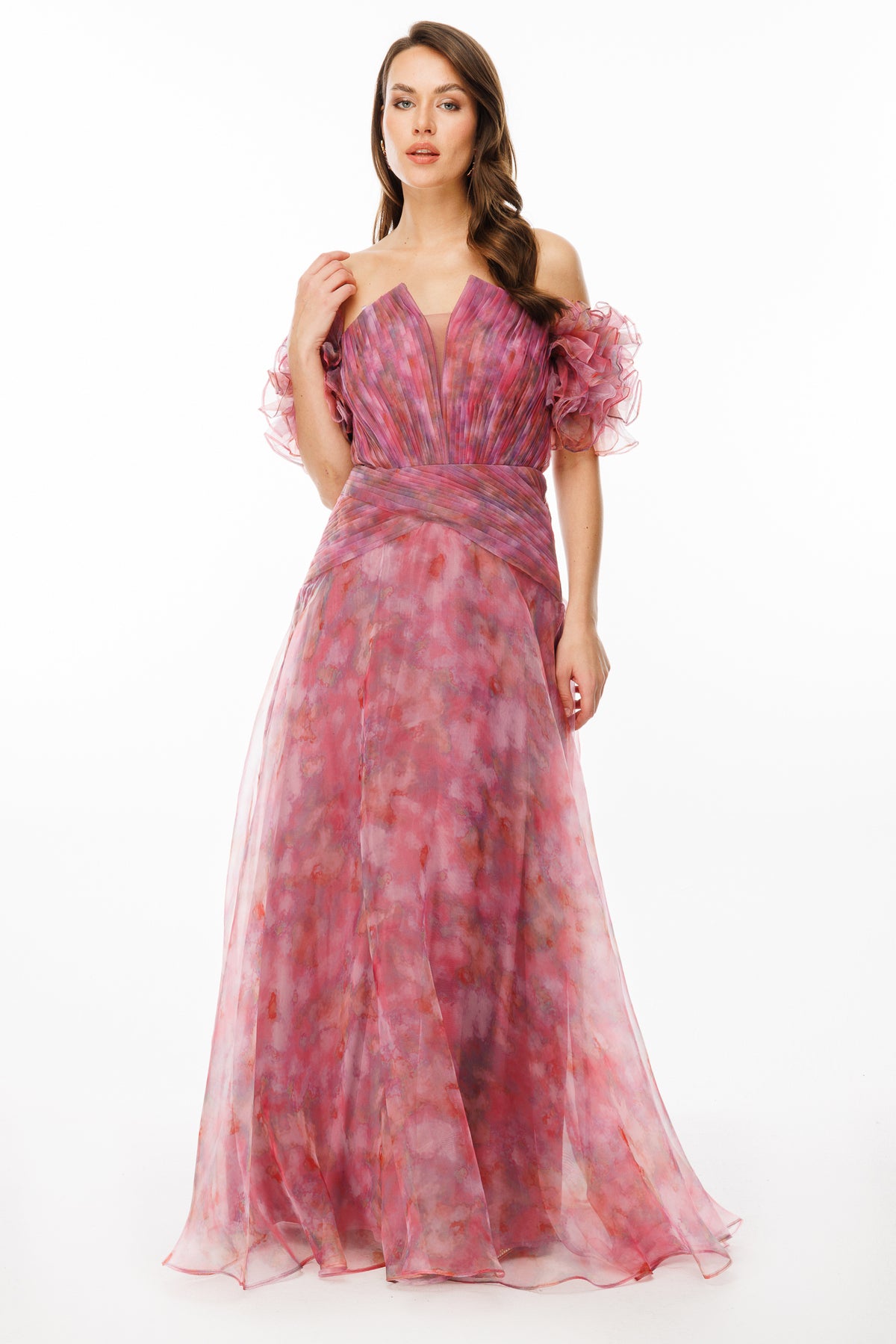 This evening dress, designed with the elegance of Hayal tulle fabric, will highlight your elegance and grace on your special night. The patterned fabric dances with the light, adding captivating depth and movement to the dress, while the V-neck and strapless cut emphasize your femininity. Ruffled balloon sleeves add a romantic and sophisticated touch, distinguishing it from classic gown designs.