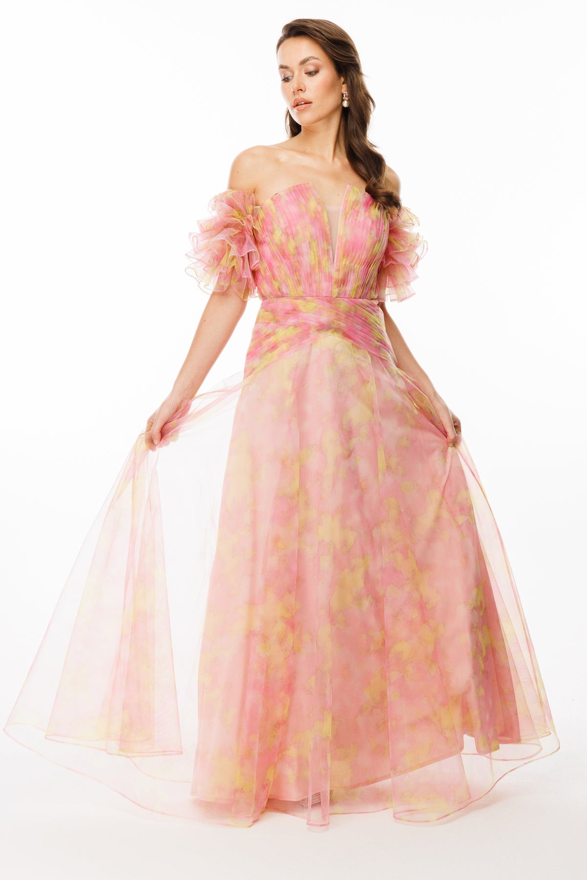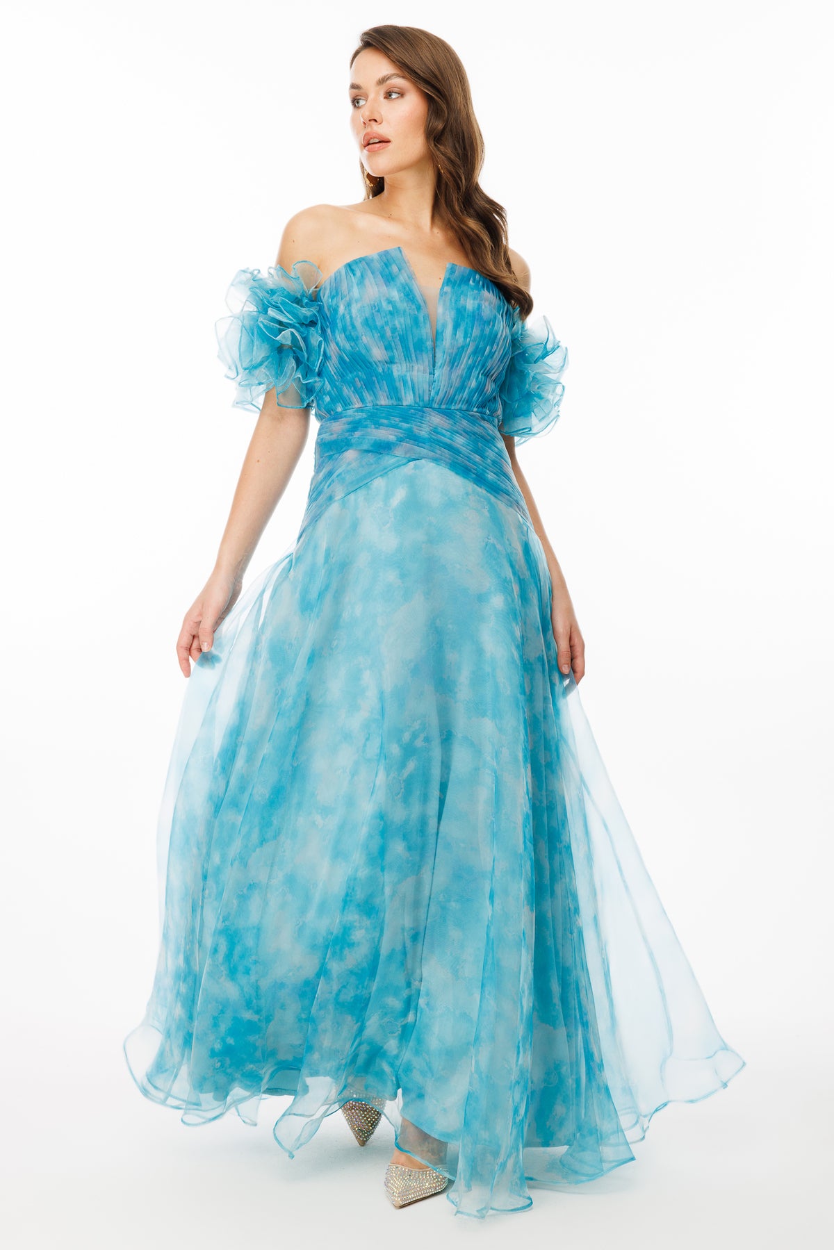 Patterned Dream Tulle Fabric V-Neck Strapless Evening Dress – Ruffle Balloon Sleeves