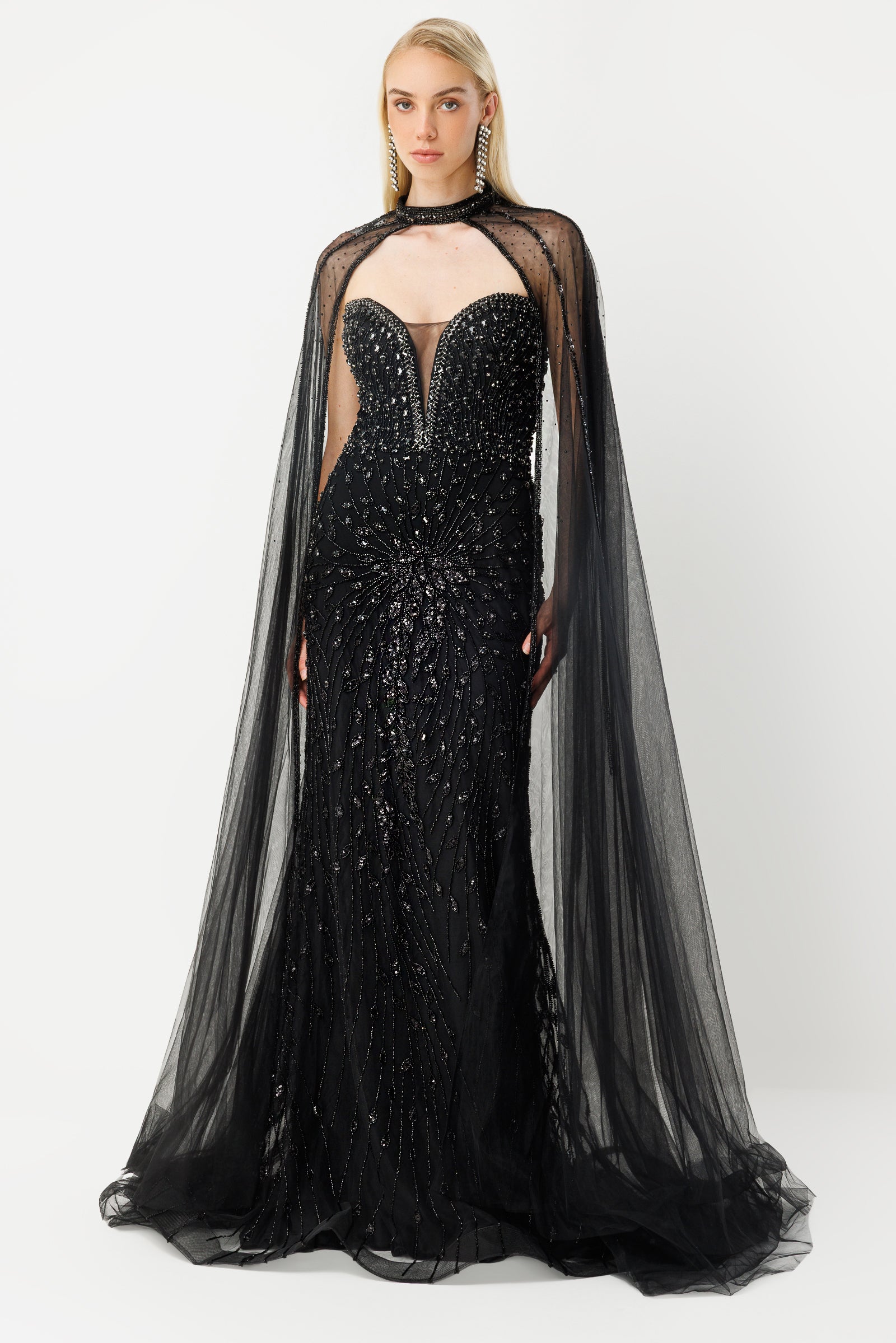 Combining elegance and sparkle, this off-the-shoulder, cape-style long evening gown is one of the most eye-catching designs for special occasions. Extensive stone and bead embellishments create an architectural form on the upper bodice, while the linear patterns descending from the waist downwards create a slimmer and longer silhouette.