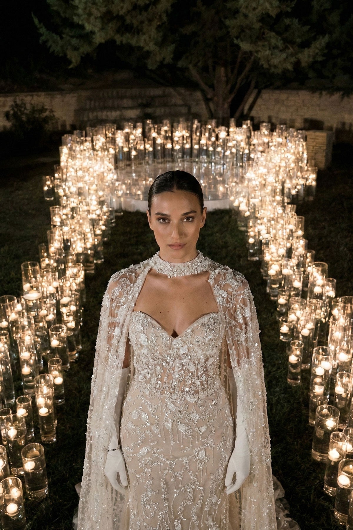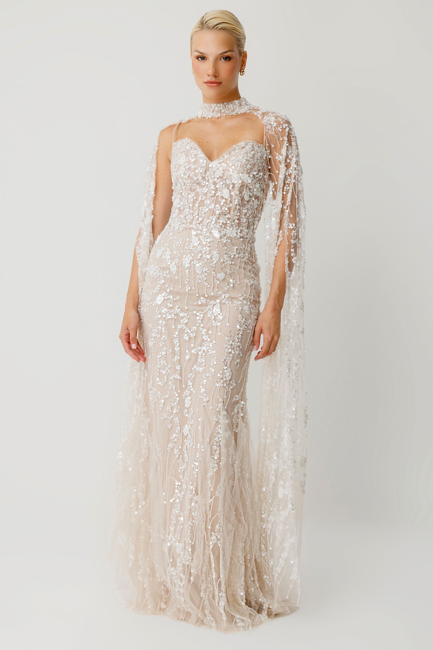 Royal Sage Choker Neck Evening Dress with Shimmering Transparent Cape
