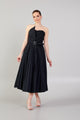 The strapless top detail of the dress leaves the shoulders exposed and adds a feminine atmosphere. The belt detail emphasizes your waist and gives an elegant shape to your silhouette. The pleat skirt adds a lively touch and adds a modern atmosphere to your evening dress.